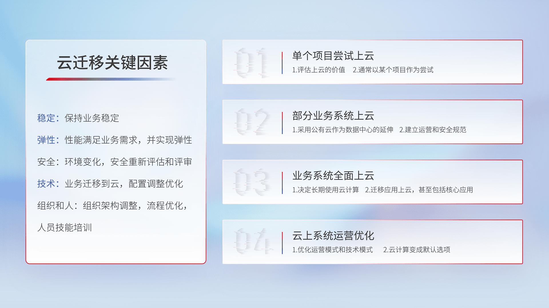 结合实际业务,,,从规划设计、、、云平台选型、、、云原生改造、、、数据迁移、、、、集成交付,,,迁移全过程为客户识别最佳上云路径,,,,做好风险识别管理,,,设计网络架构、、、、身份权限、、、安全审计合规、、、、操作审计、、、日志审计、、、、监控告警策略、、多站点容灾设计等,,,对云上基础设施进行整体规划,,,,提升IT治理水平,,以满足弹性、、、高可用、、高性能的需求。。。。