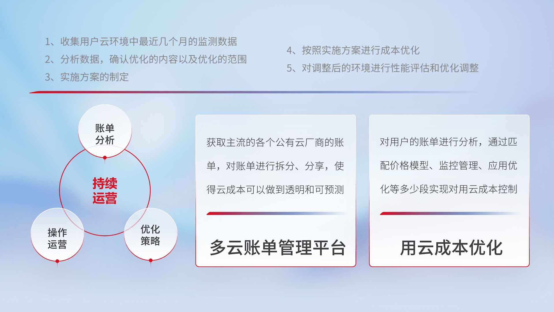 通过多云纳管,,,,以统一的资源数据模型把客户的云资源进行抽象和封装,,,,进而实现对多云资源的统一操作,,保障云资源管理的可靠性、、稳定性与可用性。。。量身定制化运维内容,,,配置、、开发运维、、、补丁管理、、、、备份、、监控、、、、认证和访问管理、、、、审计和日常巡检等,,,保障在用云过程中的可靠度,,,稳定度以及高可用率。。