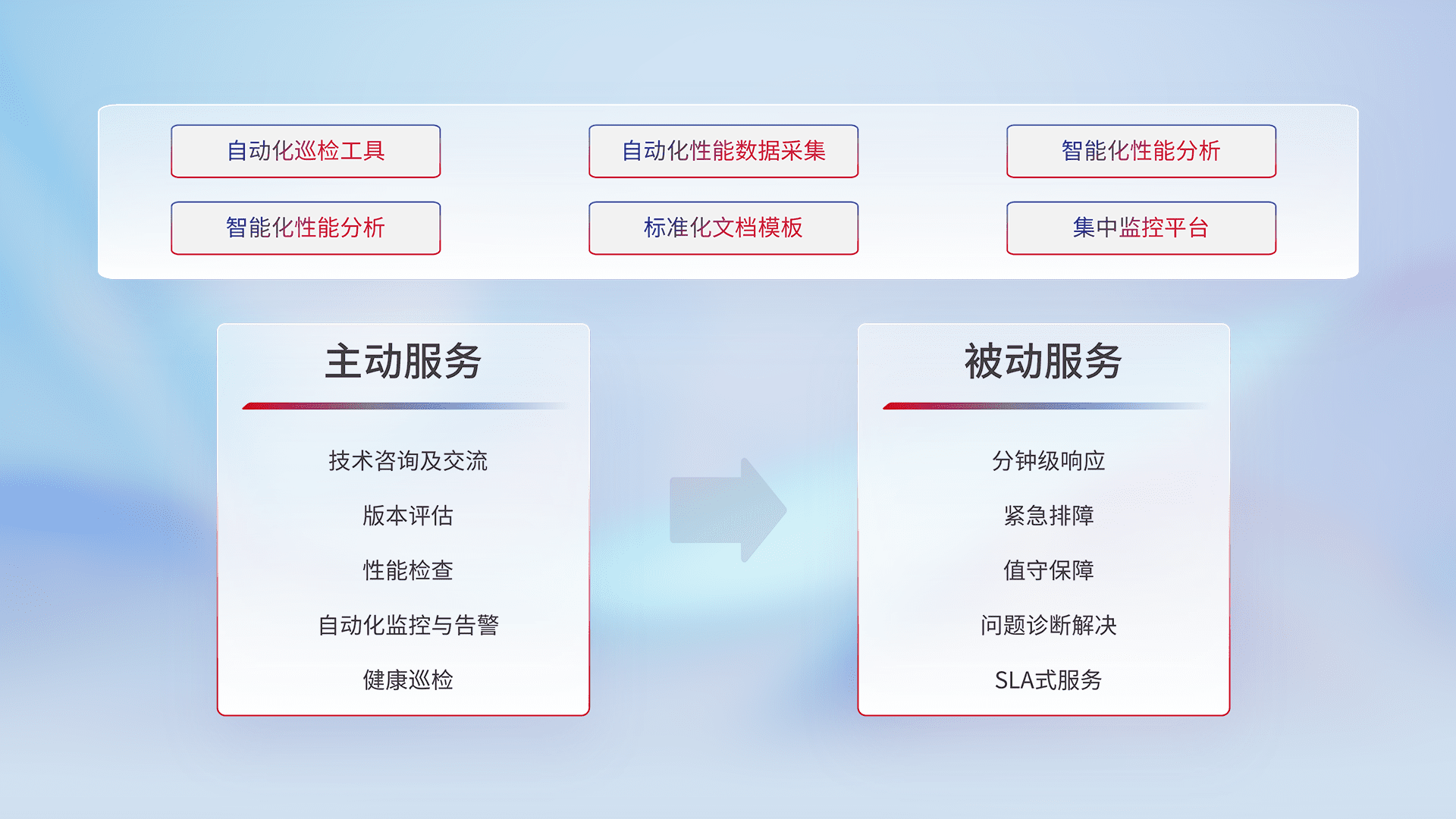 智能化工具和标准化文档,,保障服务质量,,,提供主动服务(包含技术咨询、、版本评估、、、、性能检查、、、、自动化监控与告警、、、、健康巡检)和被动服务包含(分钟级响应、、、、紧急排障、、值守保障、、问题诊断解决、、SLA服务)。。。。